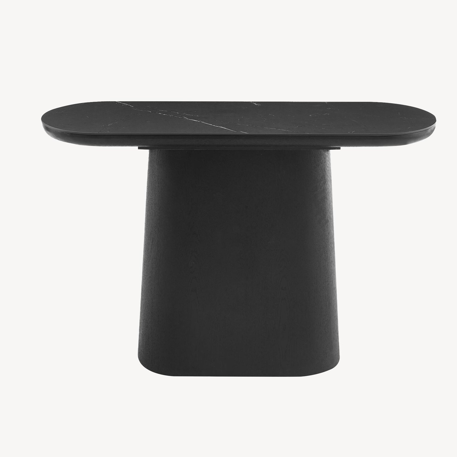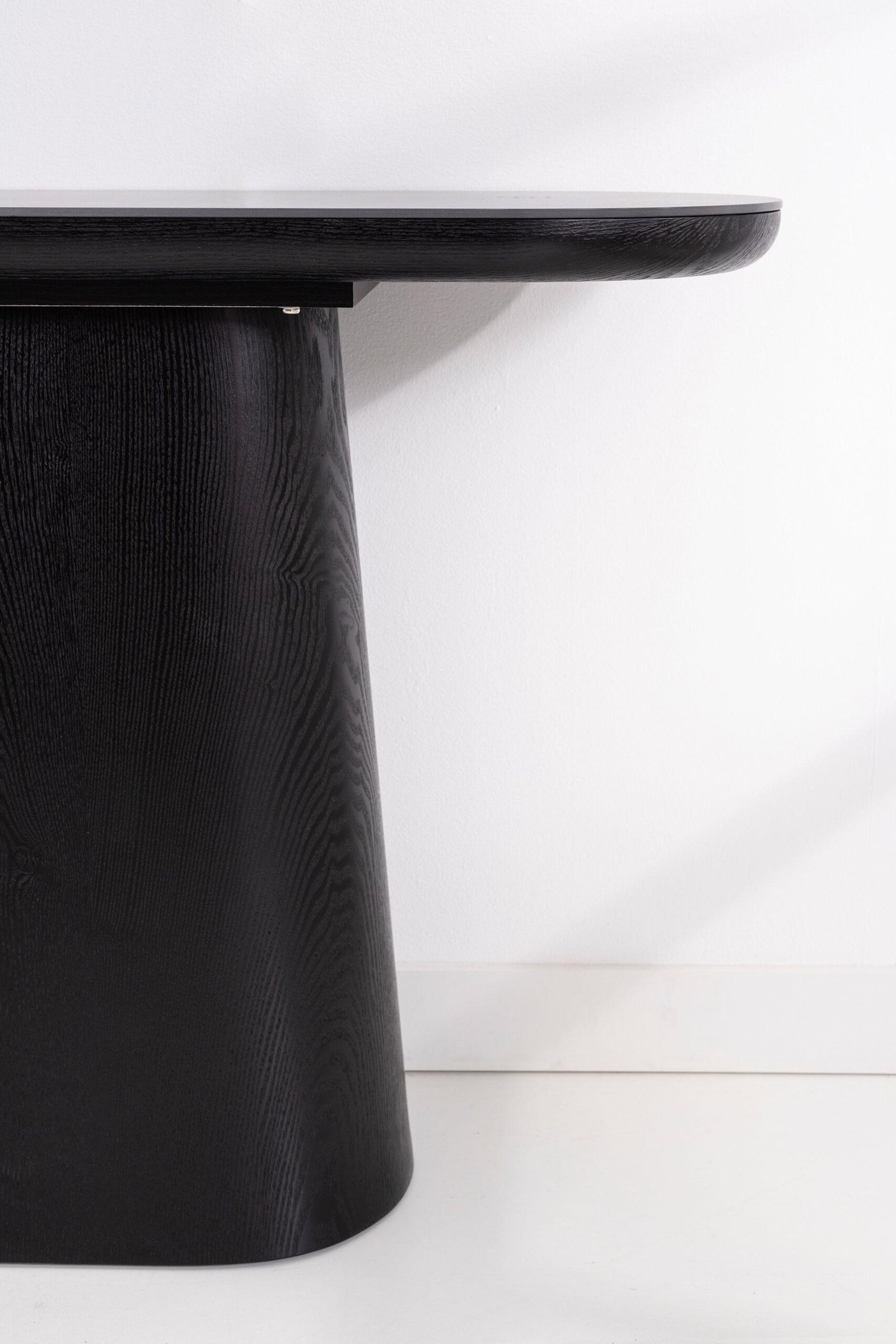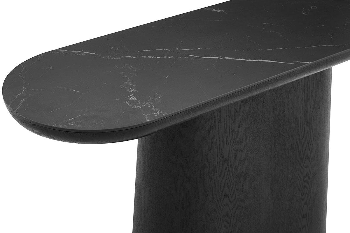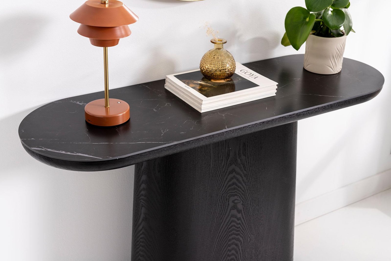 A mesa consola de 120 x 80 x 40 cm combina design contemporâneo, funcionalidade e materiais de alta qualidade. O seu tampo em porcelana preta proporciona um acabamento elegante, resistente a riscos e fácil de limpar, enquanto a base em folheado de carvalho preto oferece estabilidade, robustez e um toque moderno que se destaca em qualquer corredor ou sala de estar. Ideal para expor ornamentos, candeeiros ou molduras, esta mesa consola oferece espaço funcional sem comprometer o estilo. O seu design equilibrado e versátil permite que seja facilmente integrada numa variedade de ambientes, desde o moderno ao minimalista ou industrial. A combinação de porcelana e madeira garante durabilidade e apelo estético, fazendo desta mesa consola uma peça de mobiliário prática e sofisticada que acrescenta personalidade e elegância a qualquer casa.
