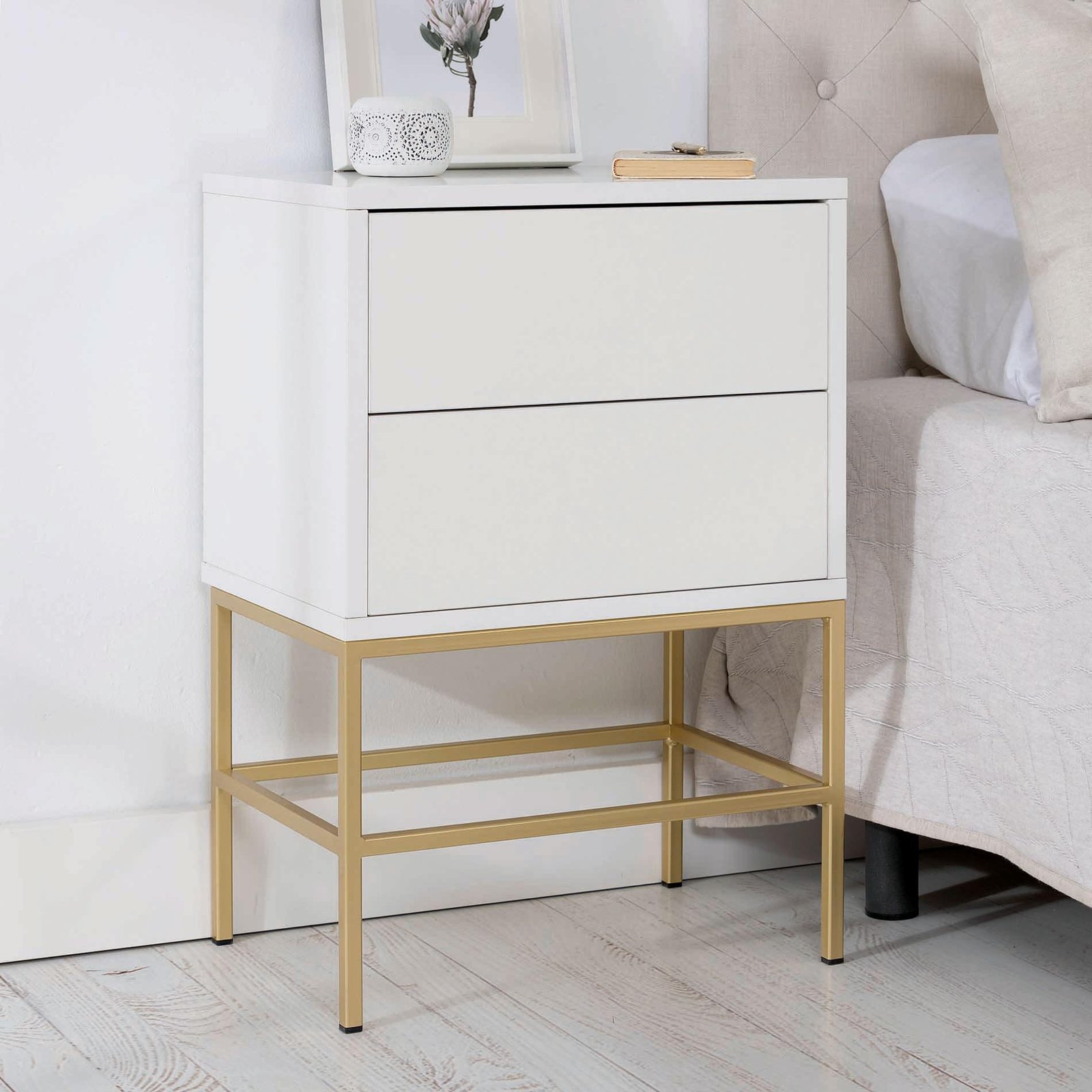 A mesa de apoio Push destaca-se pela sua elegância e funcionalidade. O acabamento em lacado branco confere luminosidade e um toque moderno, enquanto a base em metal dourado acrescenta um toque sofisticado e acolhedor que valoriza qualquer quarto ou sala de estar contemporânea. Possui duas gavetas, oferecendo um amplo espaço de arrumação para acessórios, objetos pessoais ou pequenos artigos decorativos, mantendo o ambiente organizado e arrumado. O seu design compacto permite que seja colocada ao lado da cama, do sofá ou da poltrona, acrescentando estilo sem ocupar muito espaço. A combinação da laca branca com o metal dourado garante resistência, durabilidade e um acabamento elegante. Esta mesa de apoio é uma peça de mobiliário versátil, prática e decorativa que traz personalidade e sofisticação a qualquer casa.